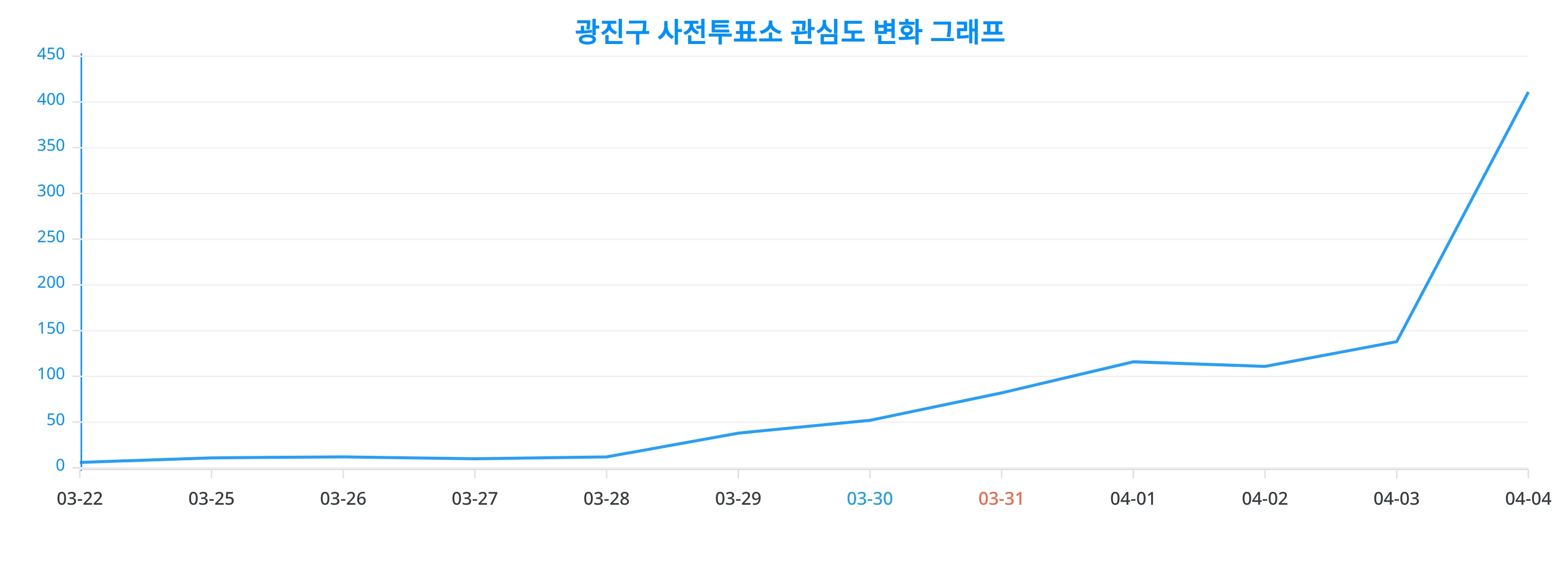 또한, 광진구 사전투표소에 대한 일간 변화 추이를 보여주는 차트는 광진구 사전투표소에 대한 관심이 어떻게 변화하고 있는지를 상세하게 보여준다.