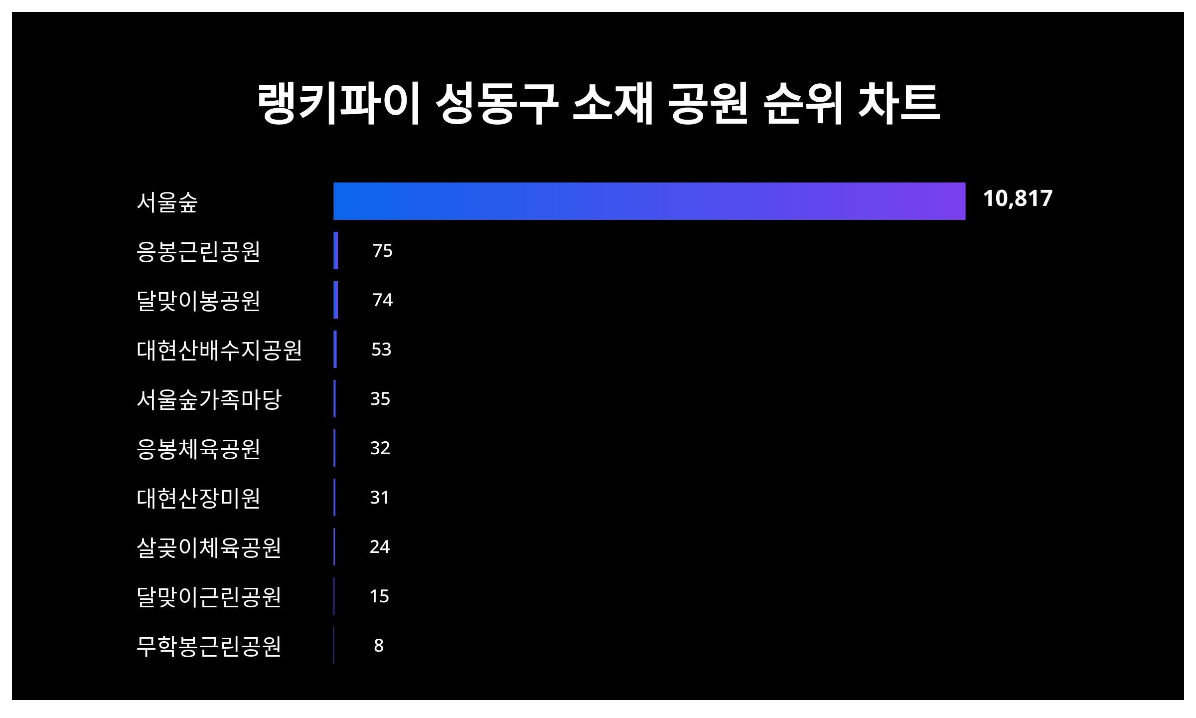 | 1 | 서울숲 | 10,817 | 30% | 70% |