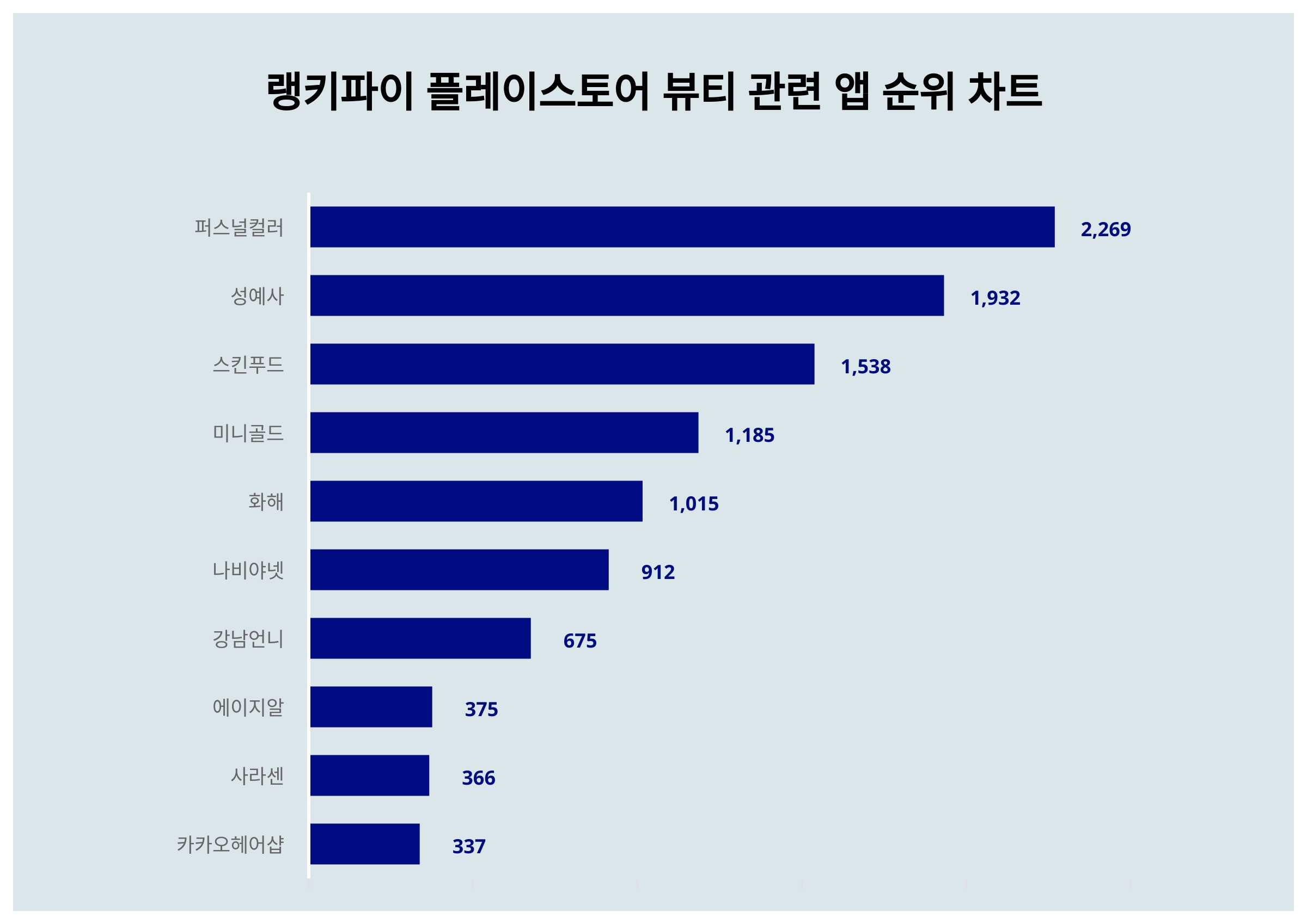 4월 2주차 플레이스토어 뷰티 관련 앱 랭키파이 분석 결과 1위를 차지한 퍼스널컬러는 트렌드 지수 2,269포인트로 전주보다 288포인트 하락했다.