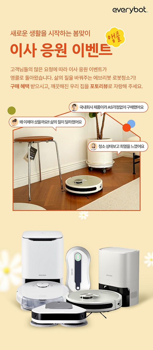 한편, 에브리봇 네이버 공식 브랜드 스토어에서는 오는 4월 15일(월)까지 ‘이사 응원 이벤트’를 단독 앵콜 진행한다. 본 행사는 지난 3월 진행되어 많은 고객들의 관심이 이어졌던 프로모션으로 이사 및 본격적인 대청소가 활발한 4월을 맞아 다시 마련되었다.