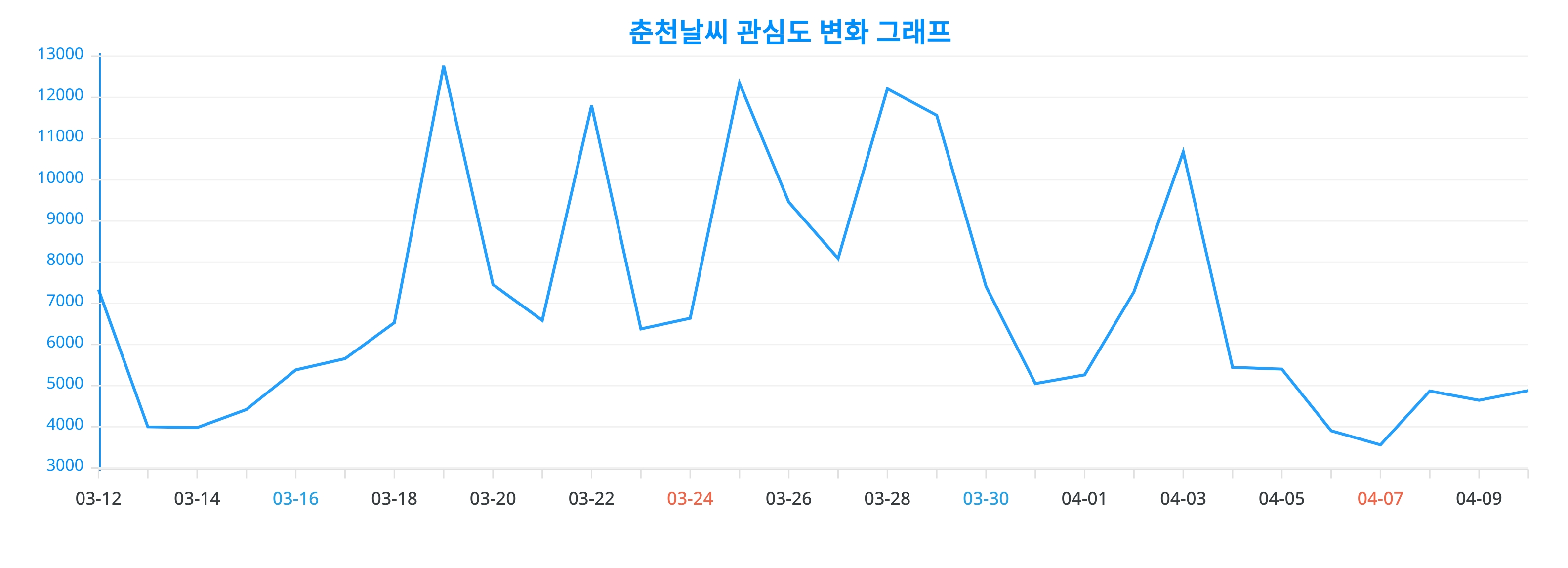 이번 분석을 통해 얻어진 춘천날씨에 대한 일간 변화 추이 차트는, 춘천날씨에 대한 관심이 어떻게 변화했는지를 생생하게 드러낸다.