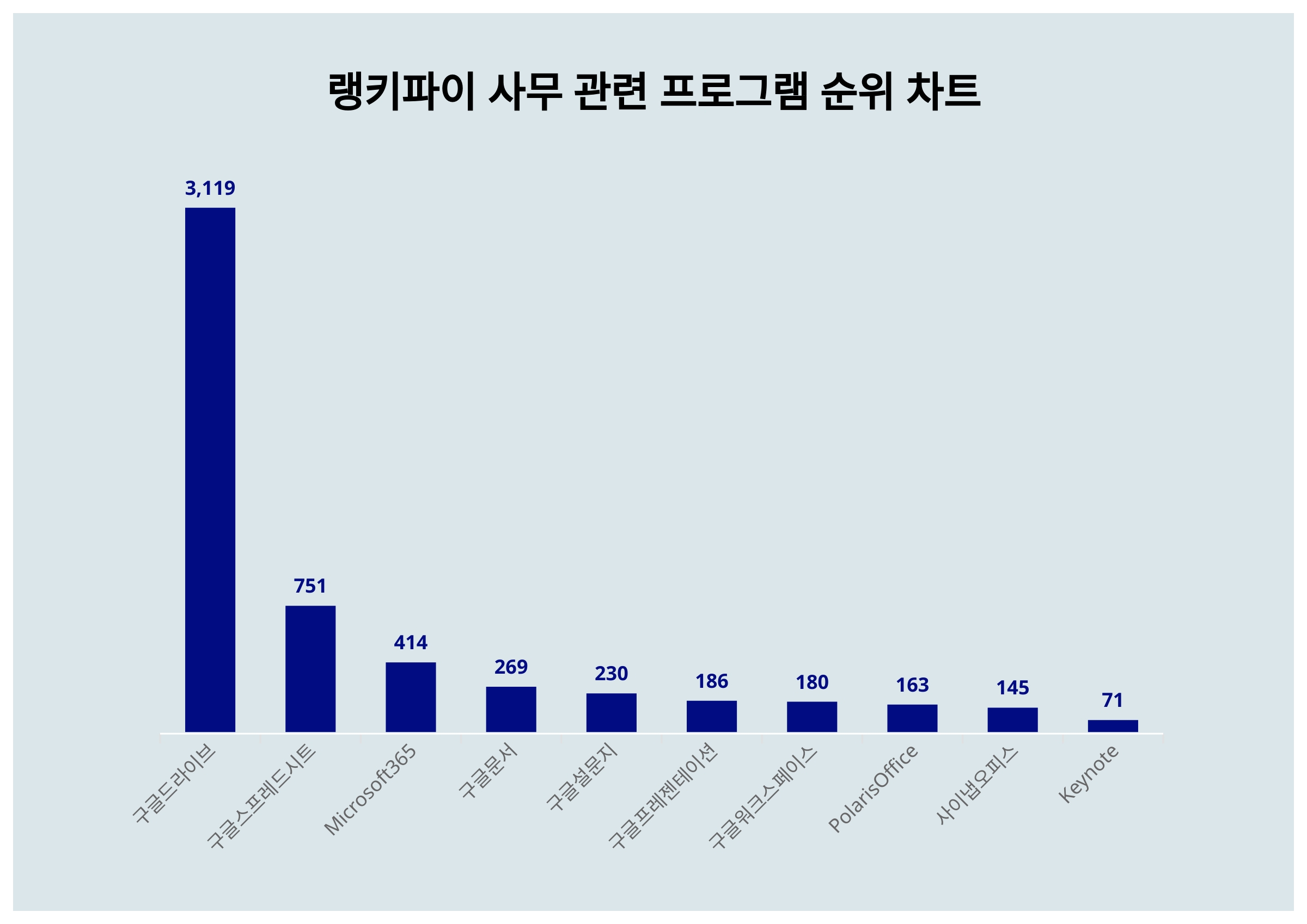 구글스프레드시트는 751포인트로 전일보다 104포인트 하락해 2위를 차지했다. Microsoft365, 구글문서, 구글설문지, 구글프레젠테이션, 구글워크스페이스, PolarisOffice, 사이냅오피스, Keynote이 뒤를 이으며 3~10위를 기록했다.