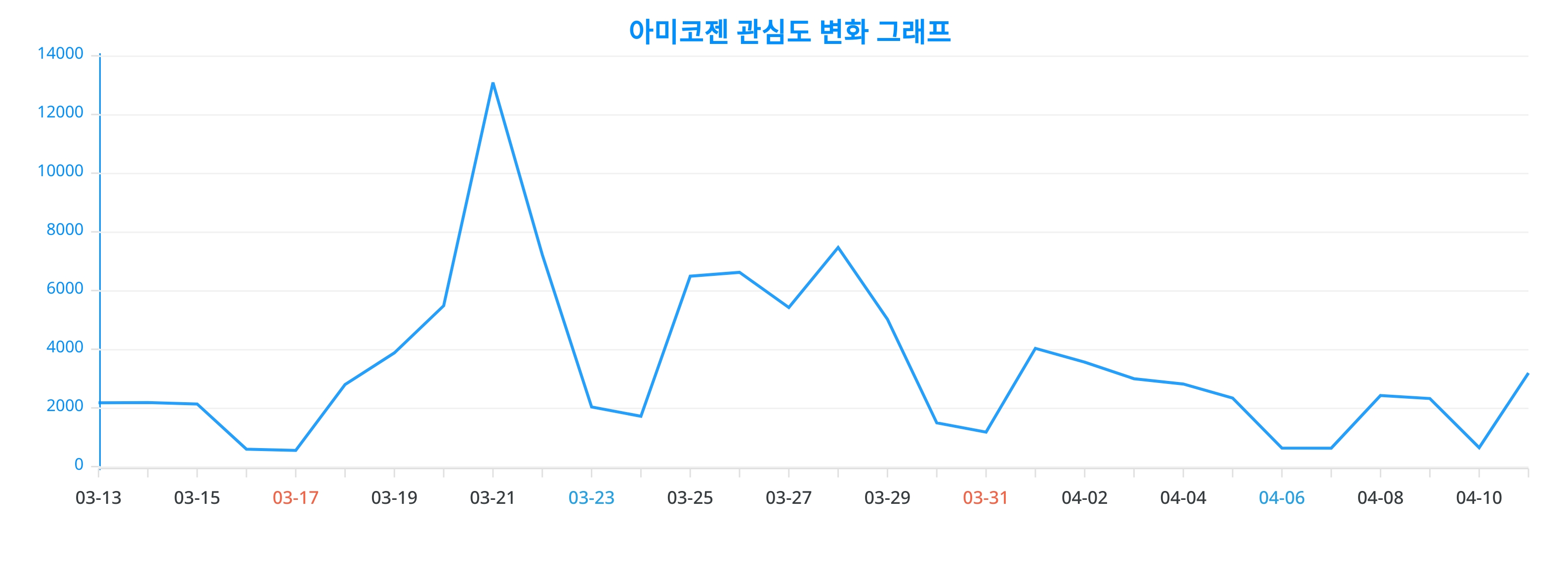 이번 분석을 통해 얻어진 아미코젠에 대한 일간 변화 추이 차트는, 아미코젠에 대한 관심이 어떻게 변화했는지를 생생하게 드러낸다.