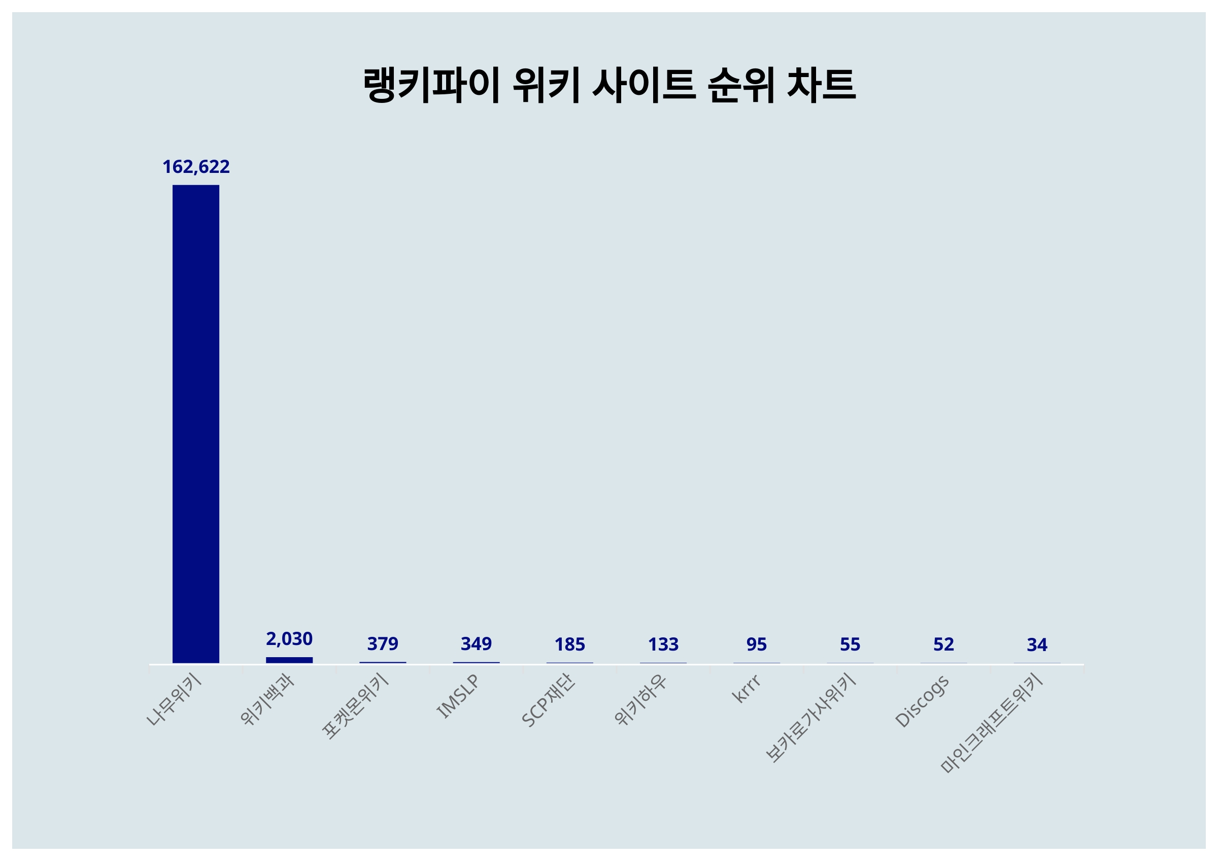 위키백과는 2,030포인트로 전일보다 32포인트 상승해 2위를 차지했다. 포켓몬위키, IMSLP, SCP재단, 위키하우, krrr, 보카로가사위키, Discogs, 마인크래프트위키가 뒤를 이으며 3~10위를 기록했다.