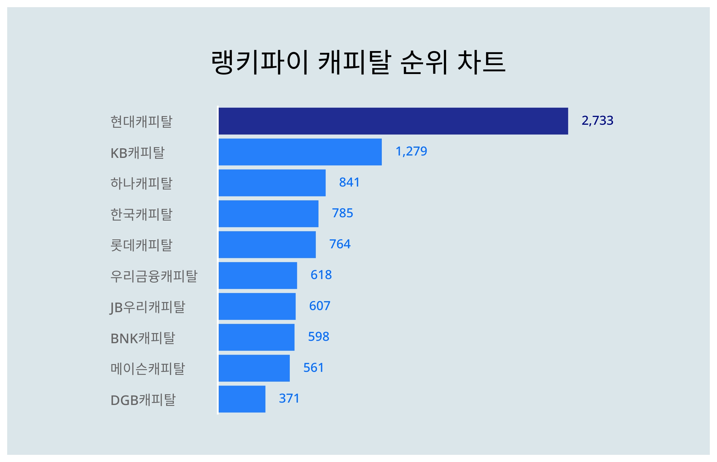 4위 한국캐피탈은 785포인트, 5위 롯데캐피탈은 764포인트, 6위 우리금융캐피탈은 618포인트, 7위 JB우리캐피탈은 607포인트, 8위 BNK캐피탈은 598포인트, 9위 메이슨캐피탈은 561포인트, 10위 DGB캐피탈은 371포인트이다.