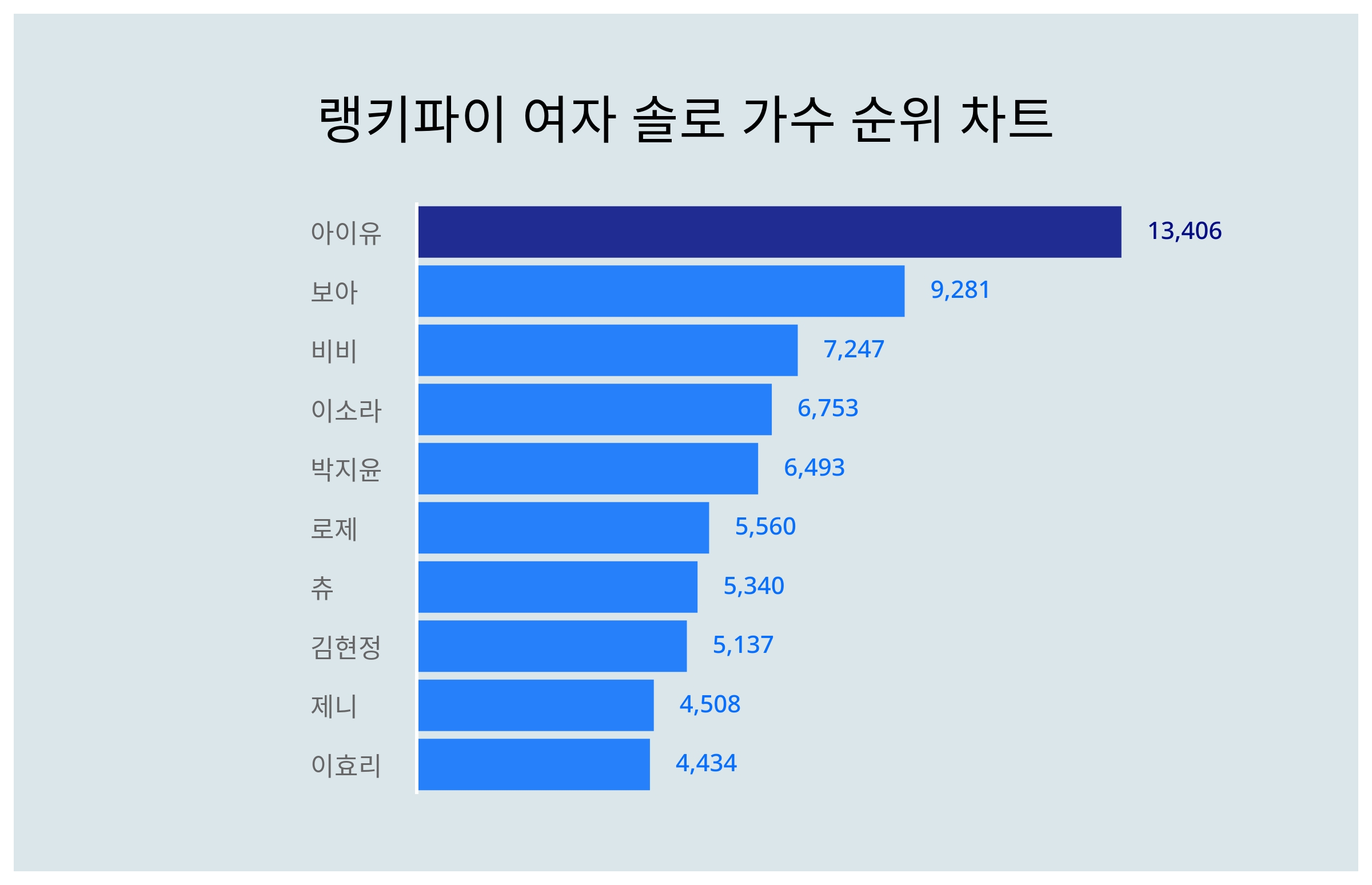 4월 3주차 여자 솔로 가수 랭키파이 분석 결과 1위를 차지한 아이유는 트렌드 지수 13,406포인트로 전주보다 1,527포인트 하락했다.