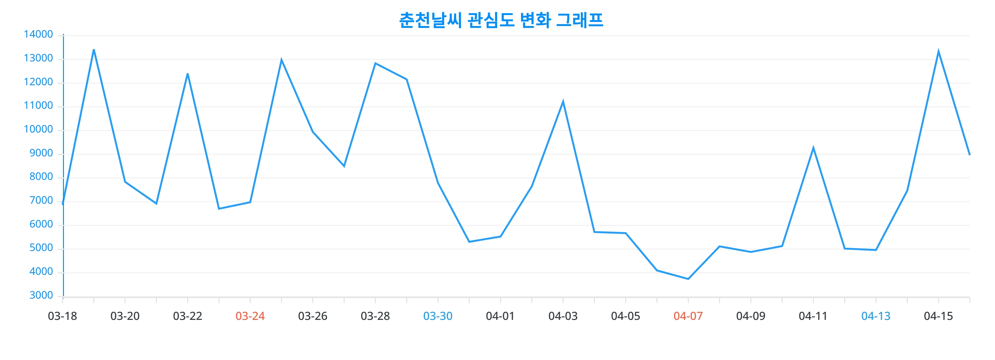 이번 분석을 통해 얻어진 춘천날씨에 대한 일간 변화 추이 차트는, 춘천날씨에 대한 관심이 어떻게 변화했는지를 생생하게 드러낸다.