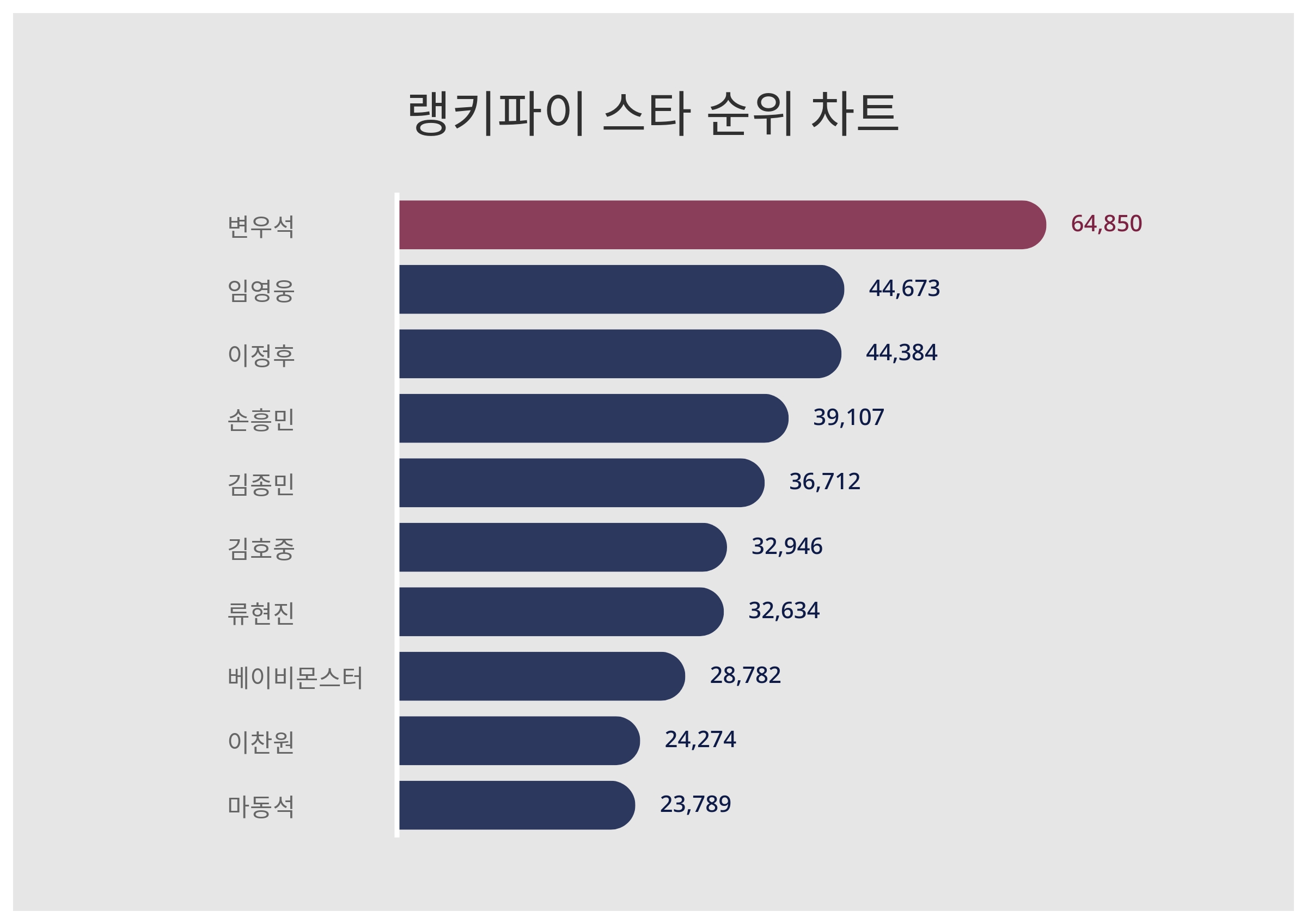 4위 손흥민은 39,107포인트, 5위 김종민은 36,712포인트, 6위 김호중은 32,946포인트, 7위 류현진은 32,634포인트, 8위 베이비몬스터는 28,782포인트, 9위 이찬원은 24,274포인트, 10위 마동석은 23,789포인트이다.