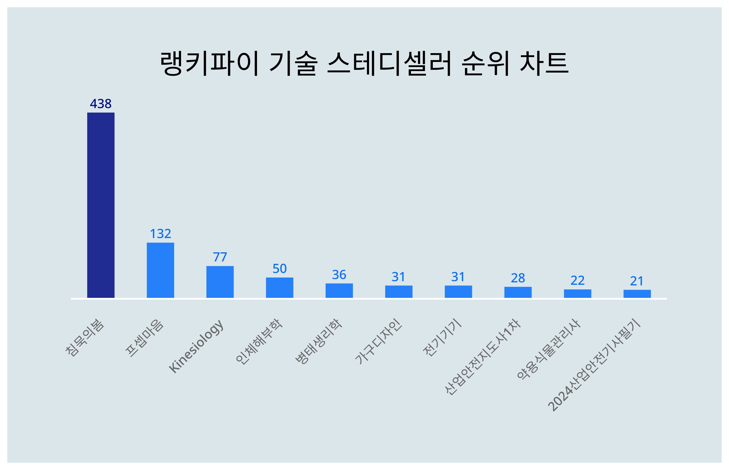 4위 인체해부학은 50포인트, 5위 병태생리학은 36포인트, 6위 가구디자인은 31포인트, 7위 전기기기는 31포인트, 8위 산업안전지도사1차는 28포인트, 9위 약용식물관리사는 22포인트, 10위 2024산업안전기사필기는 21포인트이다.