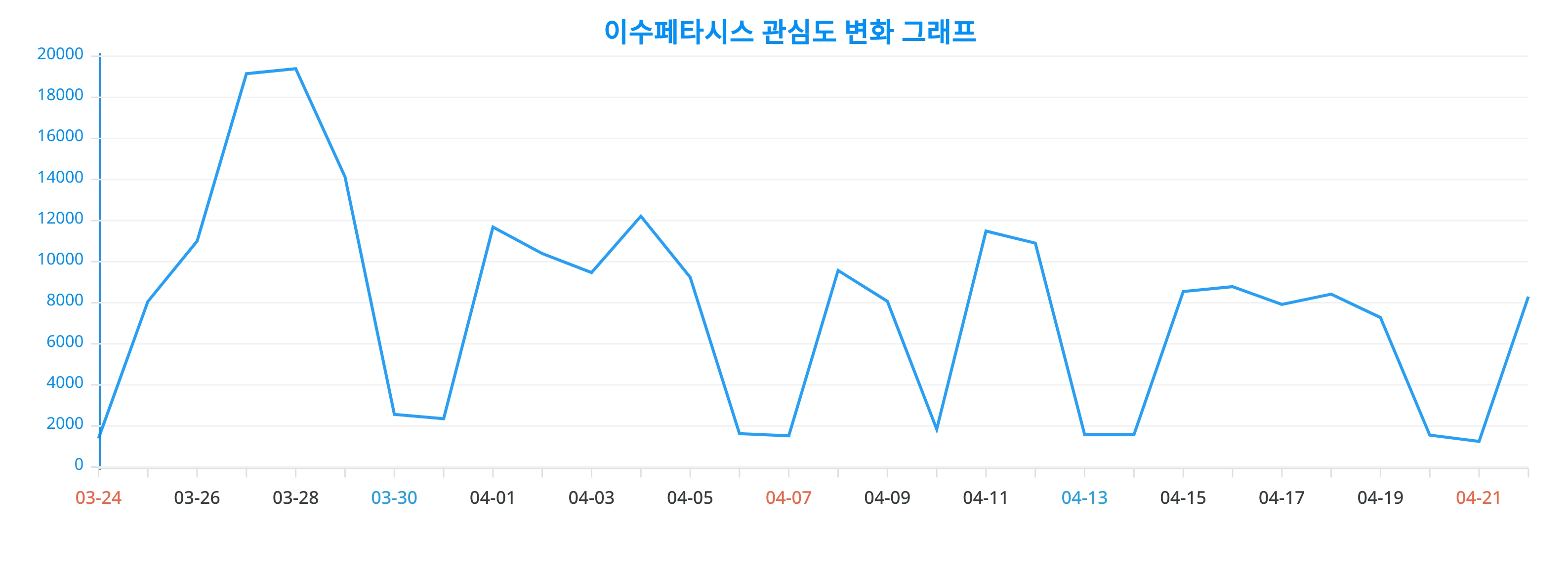 이번 분석을 통해 얻어진 이수페타시스에 대한 일간 변화 추이 차트는, 이수페타시스에 대한 관심이 어떻게 변화했는지를 생생하게 드러낸다.