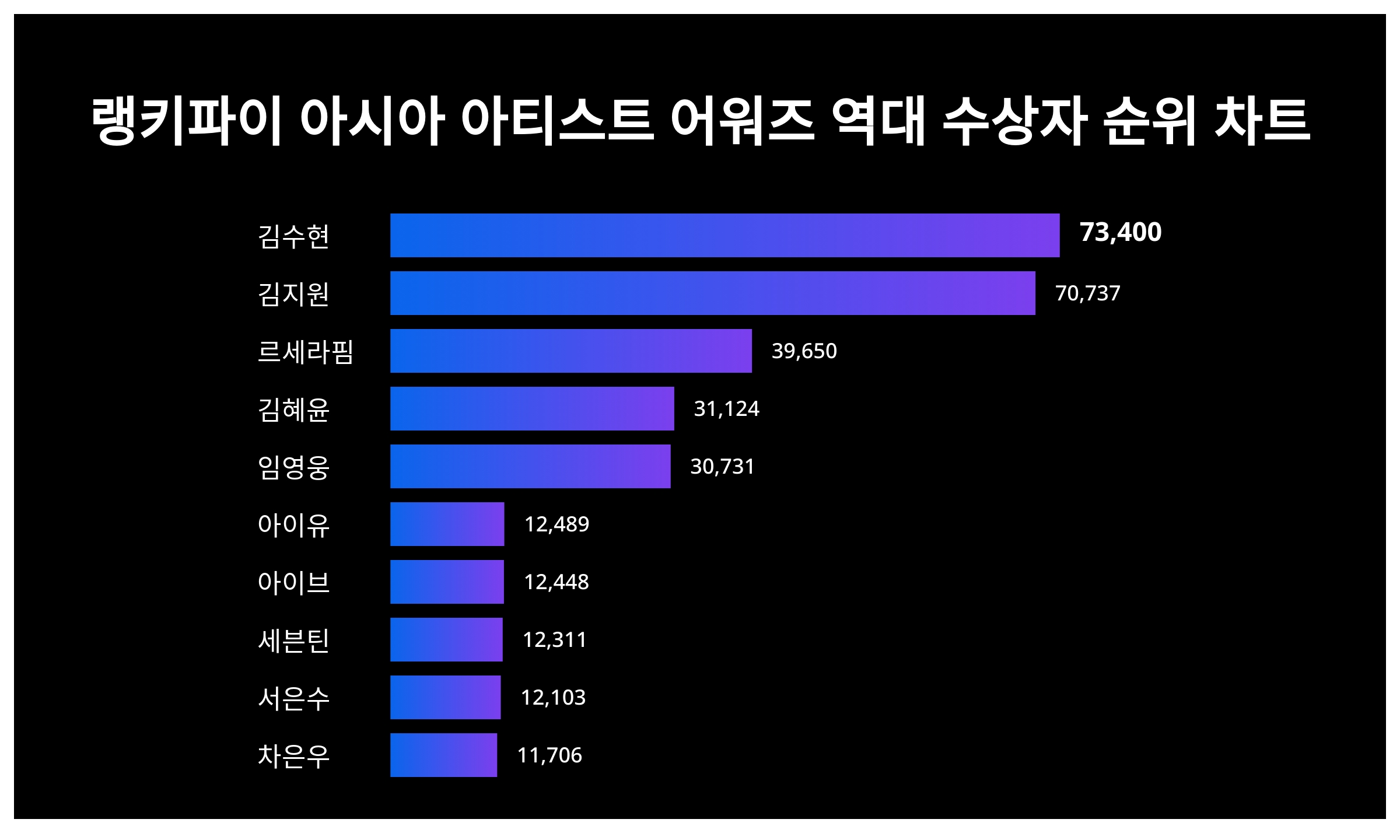 | 6 | 아이유 | 12,489 | 13,406 | -917 | -6.8% |