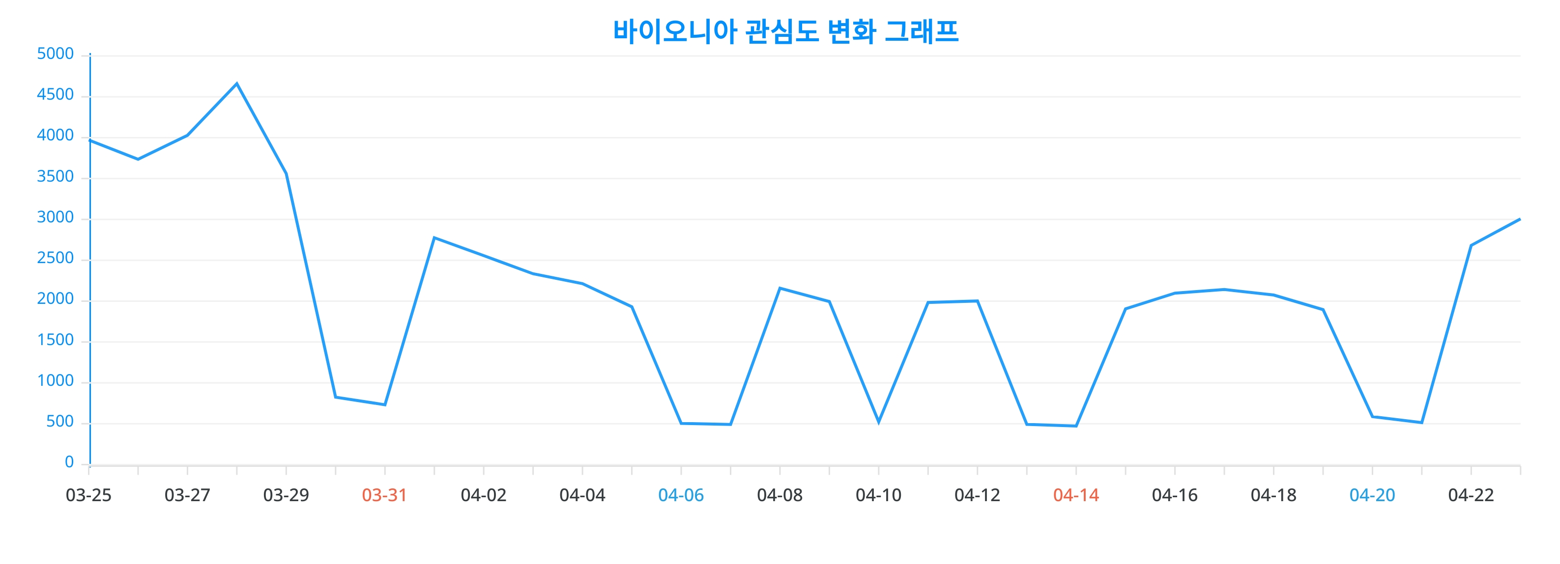 이 차트는 시간에 따른 바이오니아의 인기 변동성을 직관적으로 나태내고 있다.
