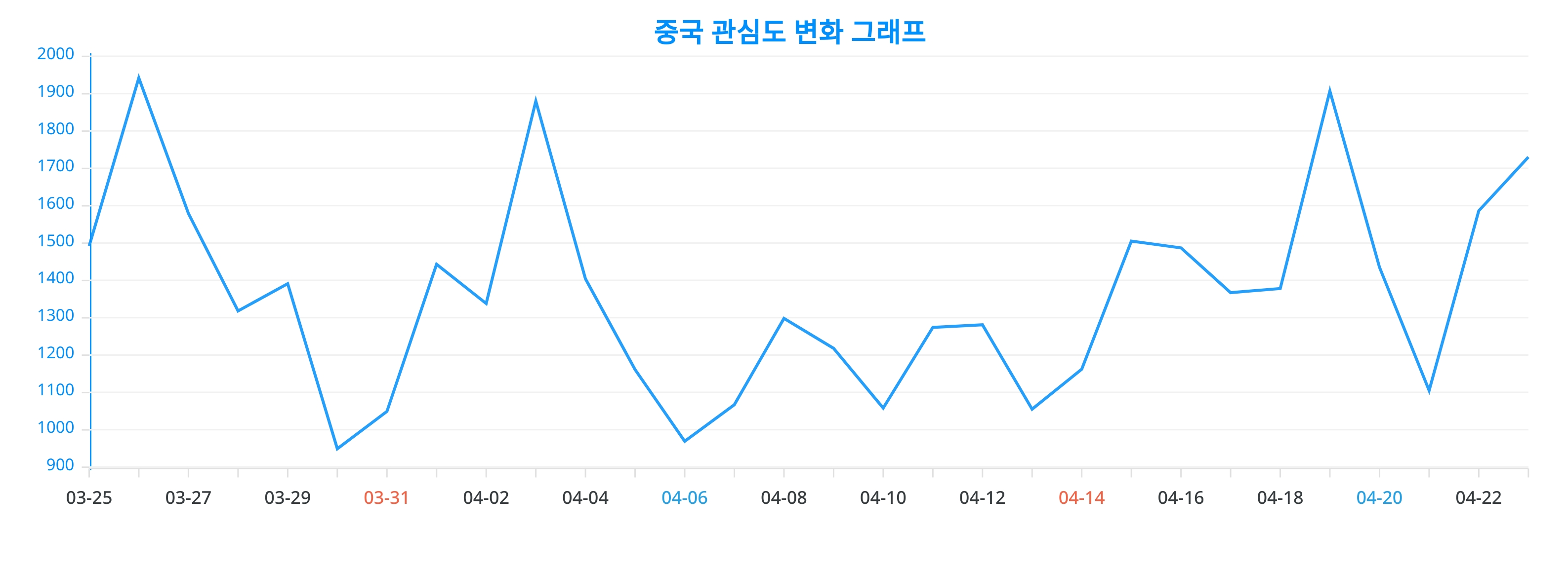 또한, 중국에 대한 일간 변화 추이를 보여주는 차트는 중국에 대한 관심이 어떻게 변화하고 있는지를 상세하게 보여준다.