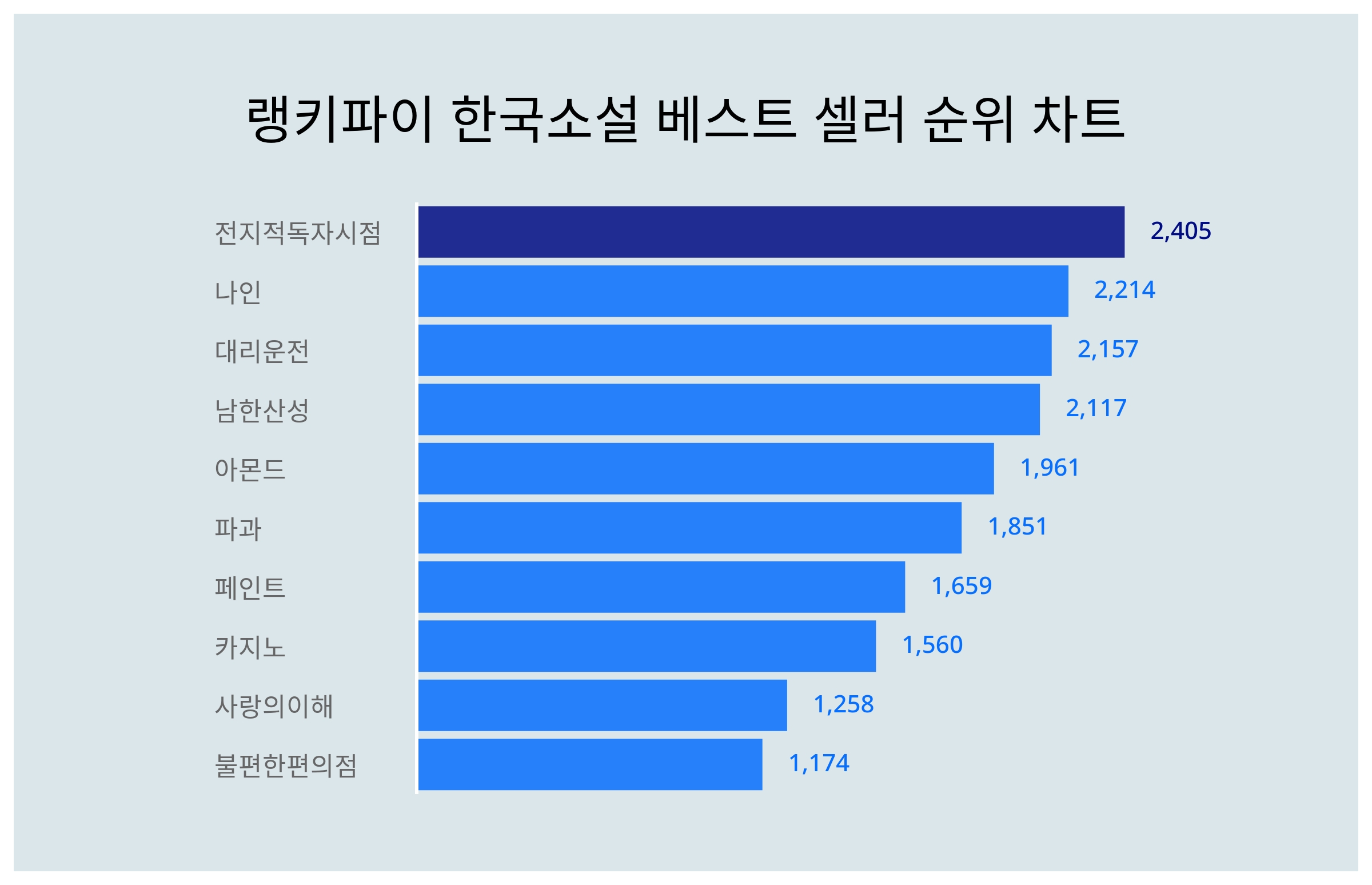 4월 4주차 한국소설 베스트 셀러 랭키파이 분석 결과 1위를 차지한 전지적독자시점은 트렌드 지수 2,405포인트로 전주보다 102포인트 상승했다.