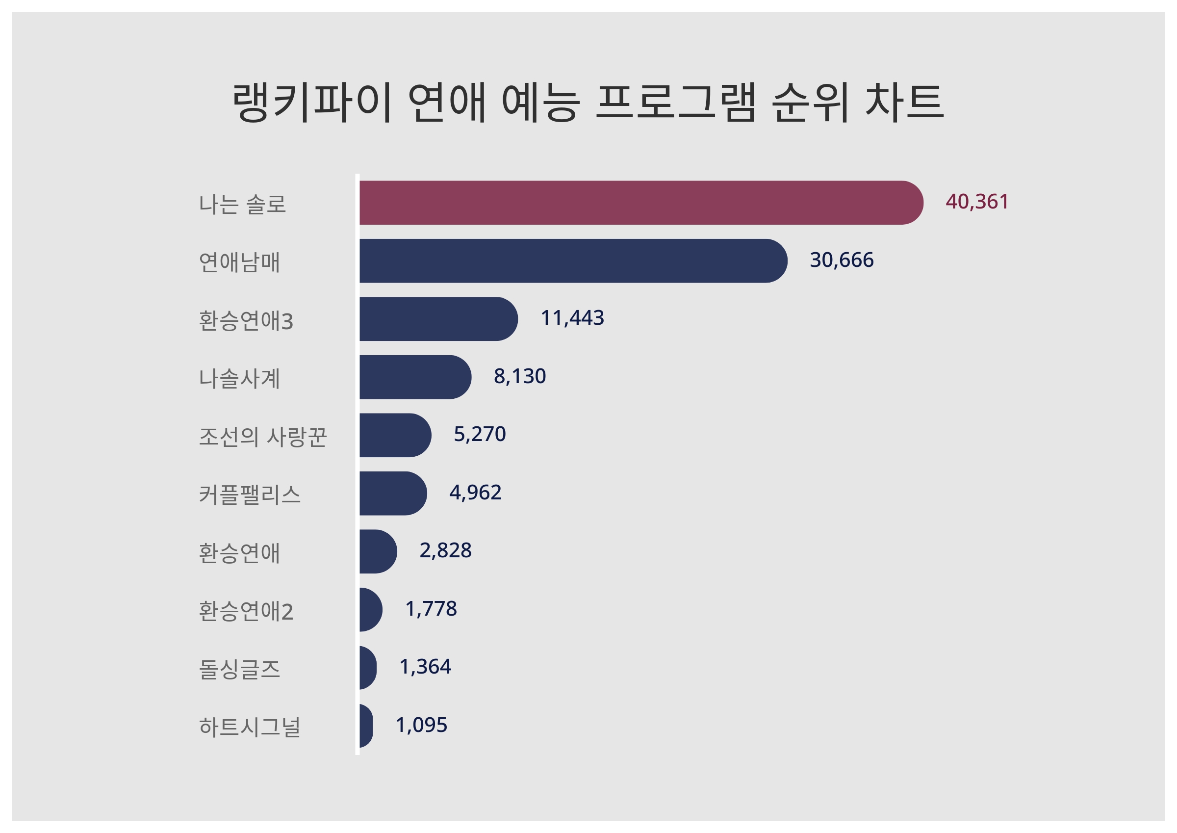 4위 나솔사계는 8,130포인트, 5위 조선의 사랑꾼은 5,270포인트, 6위 커플팰리스는 4,962포인트, 7위 환승연애는 2,828포인트, 8위 환승연애2는 1,778포인트, 9위 돌싱글즈는 1,364포인트, 10위 하트시그널은 1,095포인트이다.