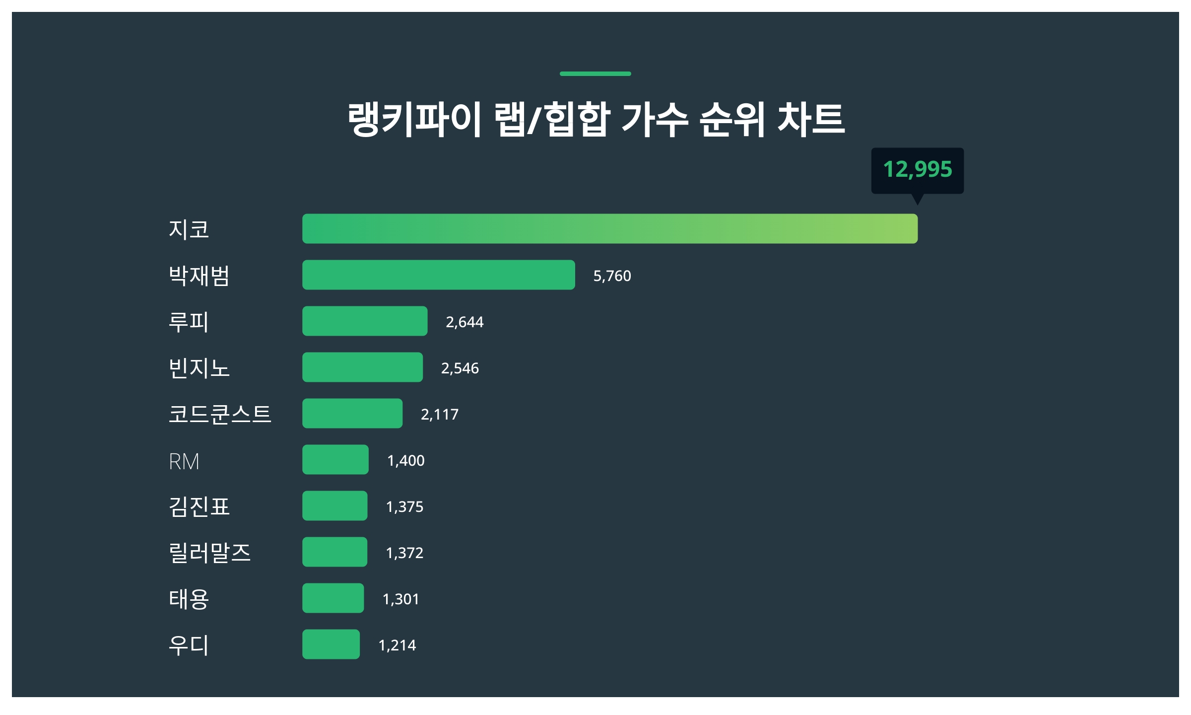 | 1 | 지코 | 12,995 | 13% | 36% | 26% | 17% | 8% |