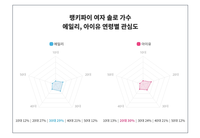 연령별 관심도 조사에서 에일리와 아이유의 관심도가 다양한 연령층 사이에서 어떻게 분포되어 있는지 명확히 드러났다. 조사 결과, 에일리는 특히 30대에서 29%의 높은 관심도를 기록하며 가장 큰 관심을 끌고 있는 것으로 나타났다. 에일리의 인기는 10대 12%, 20대 27%, 30대 29%, 40대 21%, 50대 12%순으로 이어지며, 각 연령대별에서 어떠한 관심을 받고 있는지가 조사되었다.