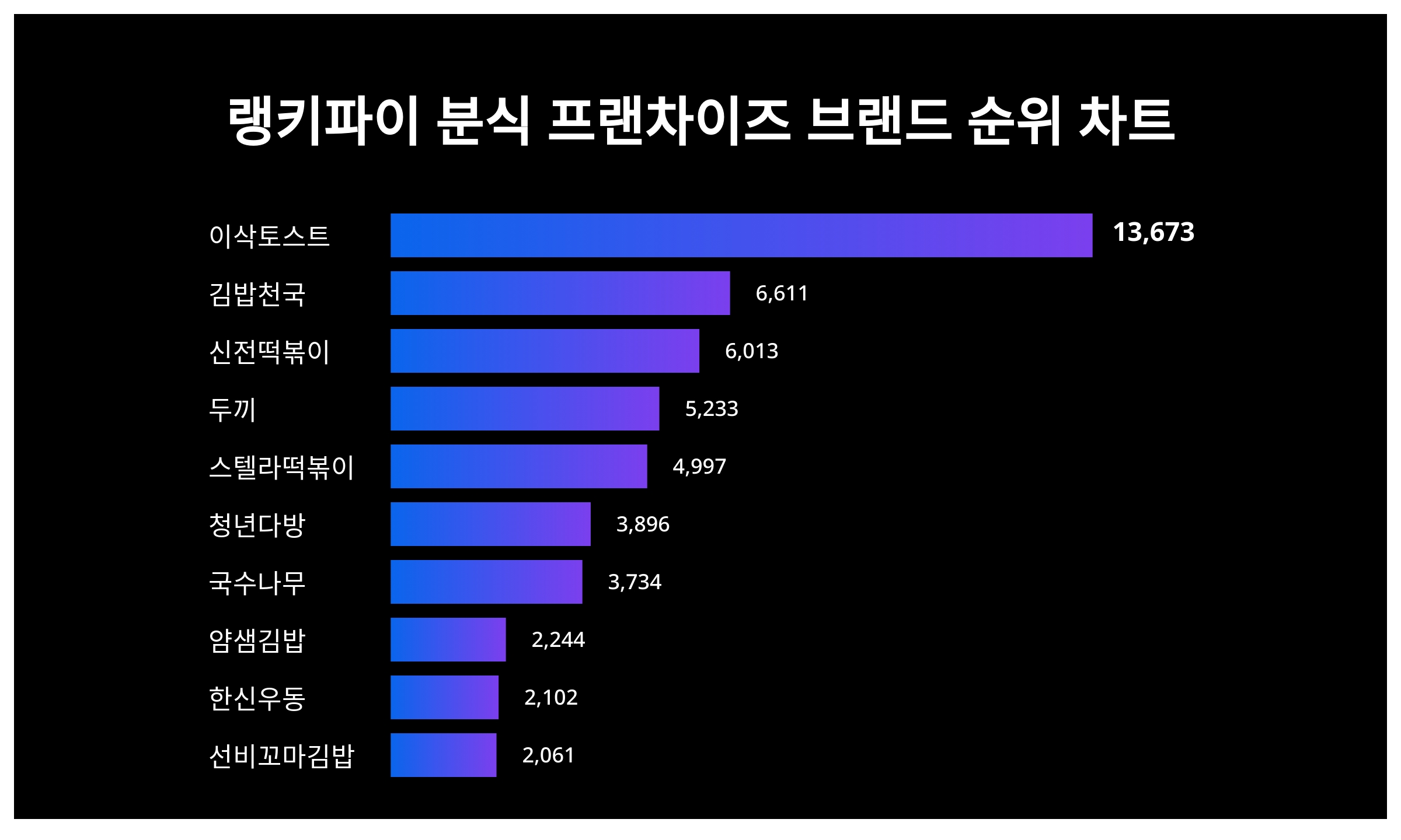 | 1 | 이삭토스트 | 13,673 | 30% | 70% |