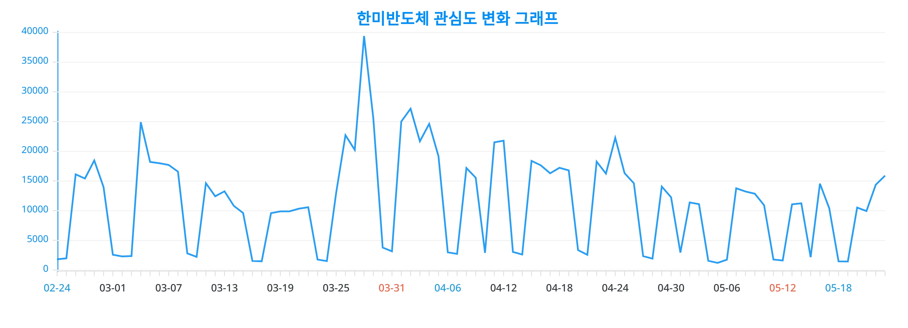 한미반도체에 관한 트렌드지수는 현재 15,906 포인트를 기록, 전일 14,381 포인트 대비 상승하였다.