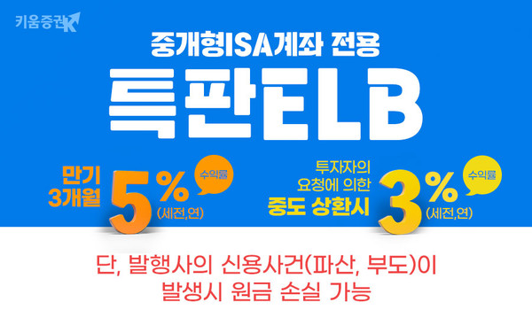 키움증권 관계자는 “최근 증시의 변동성 커지면서 단기자금 운용이 고민되는 투자자들에게 특판 ELB는 높은 수준의 금리와 절세 혜택을 누릴 수 있는 투자처가 될 수 있을 것”이라고 말했다