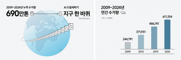 지난 2009년부터 2024년까지 누적 수거량은 무려 690만톤에 이른다. 같은 양의 드럼세탁기(위와 동일한 모델)를 일렬로 세우면 지구를 한 바퀴 돌고도 남는다. 연간 수거량도 꾸준히 증가해, 2009년 24만톤에서 2024년에는 2.5배가량 확대됐다.